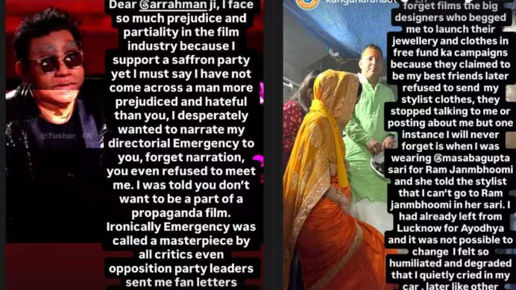 अपनी इंस्टाग्राम स्टोरी पर पोस्ट शेयर करते हुए कंगना ने रहमान की बड़ी आलोचना की. कंगना ने एआर रहमान के इंटरव्यू का वीडियो शेयर करते हुए लिखा, ‘डियर एआर रहमान जी, मुझे फिल्म इंडस्ट्री में बहुत ज्यादा भेदभाव और पक्षपात का सामना करना पड़ता है क्योंकि मैं एक भगवा पार्टी को सपोर्ट करती हूं, फिर भी मुझे कहना होगा कि मैंने आपसे ज्यादा भेदभाव करने वाला और नफरत करने वाला इंसान नहीं देखा.’
