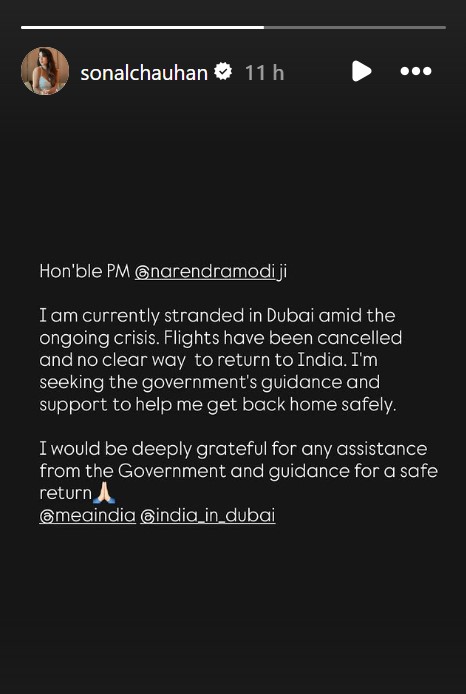 दुबई में फंसी सोनल चौहान ने सुरक्षित भारत लौटने में मदद की गुहार लगाते हुए अपनी इंस्टाग्राम स्टोरीज पर एक पोस्ट शेयर किया है, जिसमें एक्ट्रेस ने पीएम मोदी को टैग करते हुए लिखा, ‘माननीय प्रधानमंत्री नरेंद्र मोदी, मैं इस समय संकट के बीच दुबई में फंसी हुई हूं. यहां से सभी फ्लाइट्स रद्द हो चुकी हैं और भारत वापस लौटने का कोई साफ रास्ता नहीं दिख रहा है.’