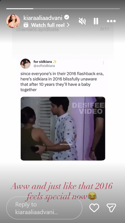 इस ट्रेंड को कियारा आडवाणी ने भी फॉलो किया है. कियारा आडवाणी ने अपने ऑफिशियल इंस्टाग्राम पर एक स्टेटस शेयर किया है. जिसमें उन्होंने अपने और सिद्धार्थ मल्होत्रा को फोटो शेयर की हैं. इसके साथ उन्होंने लिखा है कि “चूंकि हर कोई 2016 की यादों में खोया हुआ है, तो पेश है 2016 में सिडकियारा, जिन्हें इस बात का बिल्कुल भी अंदाजा नहीं था कि 10 साल बाद उनका एक बच्चा होगा.”