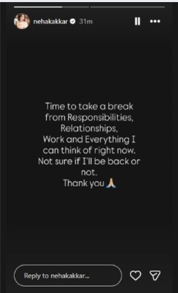 सोमवार यानी 19 जनवरी 2026 को नेहा ने इंस्टाग्राम पर लिखा था, “समय आ गया है जिम्मेदारियों, रिश्तों, काम और हर उस चीज से ब्रेक लेने का जिसके बारे में मैं अभी सोच सकती हूं. पता नहीं मैं वापस आऊंगी या नहीं.” इस पोस्ट के साथ उन्होंने पैपराजी से अपनी प्राइवेसी का सम्मान करने की भी रिक्वेस्ट की थी.