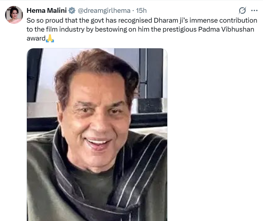 धर्मेंद्र को मरणोपरांत पद्म विभूषण अवॉर्ड से सम्मानित किया जाएगा. इसको लेकर हेमा मालिनी ने खुशी जताते हुए एक ट्वीट किया. जिसमें उन्होंने धरम जी की फोटो शेयर की है और इसके कैप्शन में लिखा, “मुझे बेहद गर्व है कि सरकार ने फिल्म उद्योग में धरम जी के अपार योगदान को मान्यता देते हुए उन्हें प्रतिष्ठित पद्म विभूषण पुरस्कार से सम्मानित किया है.