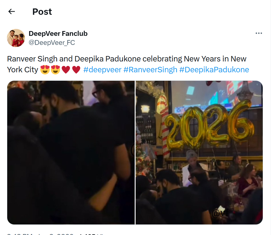 रणवीर सिंह इन दिनों धुरंधर की सक्सेस को एंजॉय कर रहे हैं. उनकी यह फिल्म सिनेमाघरों पर रिलीज के बाद से ही छाई हुई है. मूवी ने अभी तक 29 दिनों में 1100 करोड़ से भी ज्यादा का कलेक्शन कर लिया है. वहीं, फिल्म की सक्सेस के बीच रणवीर अपनी पत्नी के साथ न्यूयॉर्क में न्यू ईयर का जश्न मना रहे हैं. दोनों की पार्टी करते हुए कुछ तस्वीरें सोशल मीडिया पर वायरल हो रही हैं. इस दौरान दोनों ही एक दूजे को किस करते हुए नजर आ रहे हैं.