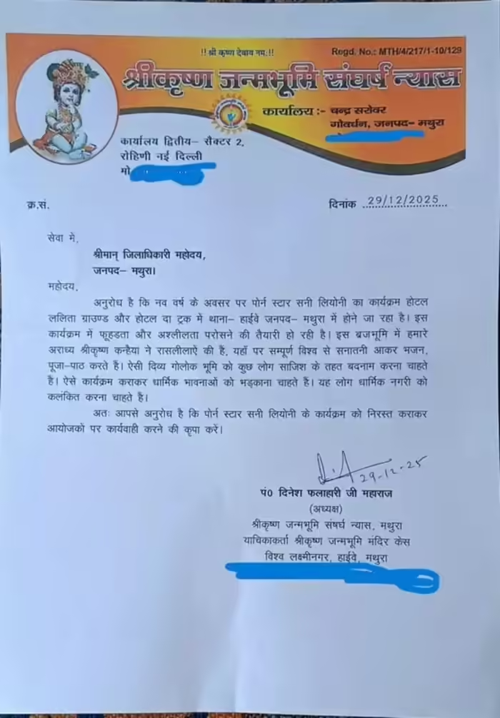 सनी लियोनी का मथुरा में इवेंट आखिरी वक्त में कैंसिल हुआ है. एक्ट्रेस को 1 जनवरी, 2026 को डीजे (डिस्क जॉकी) के तौर पर इवेंट में शामिल होना था. जहां श्री कृष्ण जन्मभूमि संघर्ष न्यास की तरफ से जिलाधिकारी को पत्र लिखकर अनुरोध किया गया कि इस कार्यक्रम को रद्ध कराया जाए. पत्र में लिखा गया कि यह धर्मनगरी है और यहां पूरी दुनिया से लोग आकर पूजा-पाठ और भजन करते हैं. इसे कुछ लोग साजिश के तहत बदनाम करना चाहते हैं.
