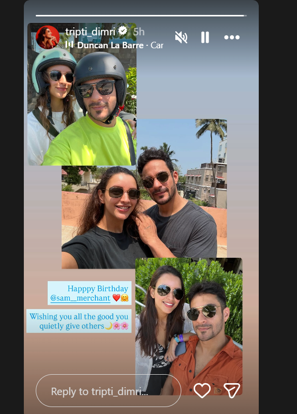 दरअसल, तृप्ति ने अपने इंस्टाग्राम पर फोटो शेयर की है. उन्होंने रूमर्ड बॉयफ्रेंड सैम मर्चेंट को उनकी जन्मदिन की बधाई देते हुए, तीन तस्वीरों का कोलाज बनाकर पोस्ट किया है. इन तीनों फोटोज में तृप्ति स्माइल करते हुए दिख रहे हैं. एक फोटो तृप्ति और सैम ने सिर पर हेलमेट पहना है. वहीं, दूसरी तस्वीर में सैम ने तृप्ति के कंधे पर हाथ रखा है और तीसरी फोटो में तृप्ति ने सैम के कंधे पर हाथ रखा है. फोटोज में दोनों के बीच अच्छी बॉन्डिंग देखने को मिल रही है.फोटोज को शेयर करते हुए एक्ट्रेस ने कैप्शन में लिखा, “‘जन्मदिन मुबारक हो सैम. भगवान आपका भला करे. आप चुपचाप दूसरों को बहुत कुछ देते हो.’