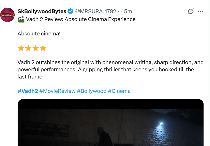 एक और यूजर ने लिखा, “वध 2 समीक्षा: सिनेमा का बेजोड़ अनुभव, शानदार एक्सपीरियंस. वध 2 अपनी शानदार लेखन शैली, सटीक निर्देशन और दमदार अभिनय से मूल फिल्म को भी मात देती है. एक रोमांचक थ्रिलर जो आपको आखिरी दृश्य तक बांधे रखती है.
