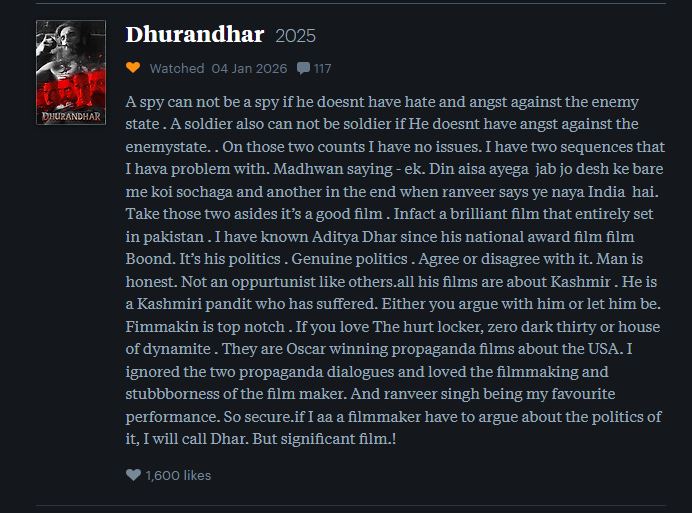 अनुराग कश्यप ने लेटरबॉक्सडी पर ‘धुरंधर’ का एक बारीकी से रिव्यू शेयर किया है, जिसमें उन्होंने लिखा, ‘एक जासूस, जासूस नहीं हो सकता अगर उसके मन में दुश्मन देश के खिलाफ नफरत और गुस्सा न हो. ठीक उसी तरह एक सैनिक भी सैनिक नहीं हो सकता अगर उसके मन में दुश्मन देश के खिलाफ गुस्सा न हो. मुझे इन दो बातों पर कोई दिक्कत नहीं है. मुझे फिल्म के सिर्फ दो सीक्वेंस से दिक्कत है. पहला है आर. माधवन का डायलॉग- ‘एक दिन ऐसा आएगा जब कोई देश के बारे में सोचेगा,’ और दूसरा है रणवीर का डायलॉग- ‘ये नया इंडिया है.’ इन दो बातों को छोड़ दें तो यह एक अच्छी फिल्म है.’