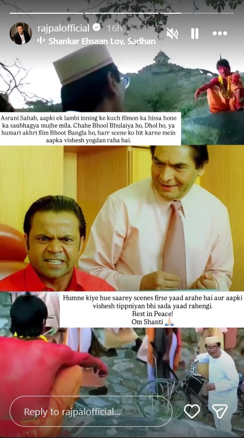 एक्टर राजपाल यादव ने अपने इंस्टाग्राम स्टोरी पर असरानी के साथ कुछ तस्वीरें शेयर करते हुए उनके निधन पर दुख जताया है. उन्होंने लिखा कि उन्हें असरानी के साथ किए गए सीन्स और उनकी टिप्पणियों की बहुत याद आ रही है. राजपाल यादव ने ये भी लिखा कि असरानी के साथ उनकी फिल्मों का हिस्सा बनना उनके लिए बड़े सौभाग्य की बात रही है.