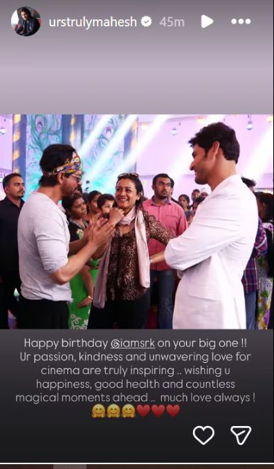 वहीं, साउथ स्टार महेश बाबू ने अपनी इंस्टाग्राम स्टोरी पर शाहरुख, अपनी पत्नी नम्रता शिरोडकर और खुद की एक पुरानी तस्वीर शेयर की है. इसके साथ उन्होंने एक स्पेशल बर्थडे कैप्शन लिखा, ‘जन्मदिन मुबारक हो शाहरुख खान. फिल्मों के लिए आपका जुनून, काइंडनेस और अटूट प्यार सच में प्रेरणादायक है… आपको खुशी, अच्छे स्वास्थ्य और आगे आने वाले अनगिनत जादुई पलों की शुभकामनाएं, ढेर सारा प्यार!’