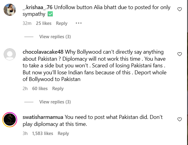 दूसरे यूजर ने लिखा, ‘आप मुश्किल समय में देश के साथ खड़े होने में फेल रहे। ये पोस्ट अब सिर्फ एक कवर अप है!’ तीसरे ने बोला, ‘इतनी जल्दी ही आपकी देशभक्ति जाग गई। राजी जैसी देशभक्ति वाली फिल्में करके देश के प्रति कोई समर्थन नहीं दिखाया जाएगा। इसके लिए आपको पैसे मिलते हैं। आप मुफ़्त में देशभक्ति वाली फिल्म क्यों नहीं बनाते?’