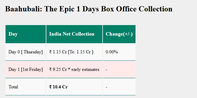Baahubali: The Epic Box Office Collection Day 1: सुपरहिट स्टार प्रभास और एसएस राजामौली की फिल्म ‘Baahubali: The Epic’ अब सिनेमाघरों में रिलीज हो गई है. फिल्म रिलीज होते ही बॉक्स ऑफिस पर छा गई है. मूवी के ओपनिंग डे कलेक्शन को देख ये कहना बिल्कुल गलत नहीं होगा एसएस राजामौली की फिल्म ने फिर से अपना जादू चला दिया है. चलिए जानते हैं ‘Baahubali: The Epic’ ने पहले दिन कुल कितनी कमाई की है?