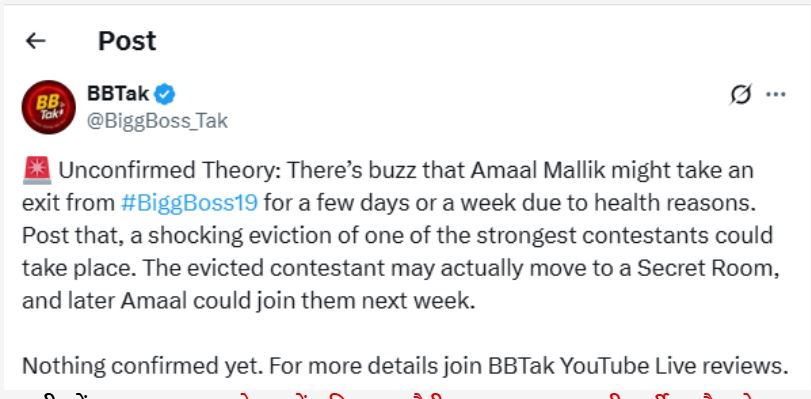 वहीं, ‘बीबी तक’ की एक दूसरी रिपोर्ट के अनुसार, अमाल मलिक बिग बॉस के घर से कुछ समय के लिए बाहर जाने वाले हैं. बताया जा रहा है कि अमाल मलिक अपने किसी हेल्थ रीजन की वजह से कुछ टाइम के लिए शो से बाहर रहेंगे. इसी बीच, अमाल के पिता डब्बू मलिक का एक X पोस्ट वायरल हो रहा है जिसमें उन्होंने लिखा, 28 को बाहर मिलते हैं.