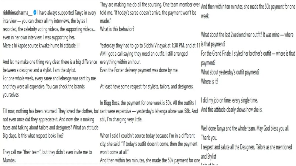 रिद्धिमा शर्मा ने आगे लिखा, मैंने तान्या मित्तल को पूरे एक हफ्ते तक हर साड़ी और लहंगा भेजा था। ये सभी कपड़े बहुत महंगे थे, आप लोग खुद इन कपड़ों के ब्रांड्स चेक कर सकते हैं।. रिद्धिमा ने आगे बताया कि तान्या मित्तल ने अभी तक उनके कपड़े लौटाए नहीं हैं. उन्होंने पोस्ट में आगे लिखा, ‘तान्या की तरफ से अभी तक कुछ भी नहीं लौटाया गया है. उन्हें कपड़े पसंद तो आए, लेकिन उन्होंने कभी एक बार भी तारीफ नहीं की. उनकी टीम के एक सदस्य ने तो ये तक भी कहा, ‘अगर आज साड़ी नहीं दी, तो पेमेंट नहीं होगी। ये कैसा बर्ताव है?’