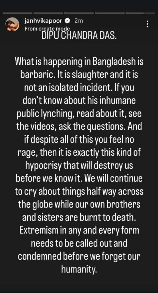 Janhavi Kapoor: बांग्लादेश में हिंदू युवक दीपू चंद्र दास की बर्बर लिंचिंग को लेकर जहां हर तरफ चुप्पी छाई हुई है, वहीं बॉलीवुड एक्ट्रेस जान्हवी कपूर ने इस घटना पर अपनी बात रखी है. उन्होंने इस निर्मम हत्या को ‘नरसंहार’ बताते हुए इसकी कड़ी निंदा की है. एक्ट्रेस ने अपने इंस्टाग्राम स्टोरी ‘दीपू चंद्र दास’ के टाइटल के साथ लिखा, “बांग्लादेश में जो हो रहा है, वह बर्बर है. यह नरसंहार है और यह कोई अकेली घटना नहीं है. अगर आपको इस अमानवीय पब्लिक लिंचिंग के बारे में नहीं पता है, तो इसके बारे में पढ़ें, वीडियो देखें, सवाल पूछें. और अगर इन सबके बावजूद आपको गुस्सा नहीं आता तो यही पाखंड हमें तबाह कर देगा, इससे पहले कि हम कुछ समझ पाएं.”