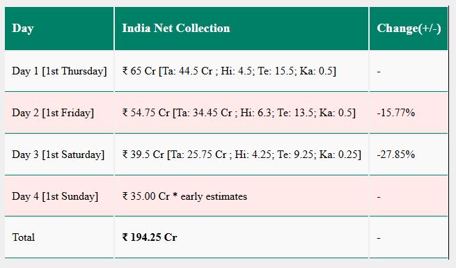 Sacnilk.com की रिपोर्ट के अनुसार, थलाइवा की फिल्म ‘कुली’ ने चौथे दिन 35 करोड़ रुपये की कमाई की है। इसी के साथ ही ‘कुली’ ने 4 दिन में 194.25 करोड़ रुपये की कमाई कर ली है। अब फिल्म 5वें दिन की कमाई के बाद बिना किसी शक के 200 करोड़ के क्लब में शामिल हो जाएगी। वहीं, अगर फिल्म के ऑक्यूपेंसी की बात करें तो, चौथे दिन इसकी कुल ऑक्यूपेंसी 63.75% थी, जिसमें सुबह के शो में 45.47%, दोपहर के शो में 69.97%, शाम के शो में 76.73%, और रात के शो में 62.81% रही। वहीं, फिल्म ने वर्ल्डवाइड में काफी अच्छा खासा कलेक्शन किया है।