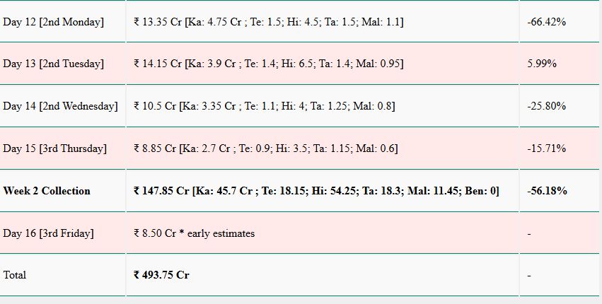 Sacnilk.com की रिपोर्ट के अनुसार, ऋषभ शेट्टी की फिल्म ‘Kantara Chapter 1’ ने 16वें दिन सिर्फ 8.50 करोड़ का कलेक्शन किया, जो फिल्म की अब तक की सबसे कम कमाई है. खैर, इसी के साथ ‘Kantara Chapter 1’ ने भारत में अब तक कुल 493.75 करोड़ का व्यापार कर लिया है. 16वें दिन इसकी ऑक्यूपेंसी भी काफी कम रही थी, जो कुल 23.51% रही, जिसमें सुबह के शो में 10.23%, दोपहर के शो में 21.36%, शाम के शो में 27.92% और रात के शो में 34.53% रहा.