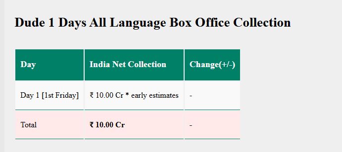 वहीं, प्रदीप रंगनाथन की नई फिल्म ‘Dude’ ने पहले दिन 10 करोड़ रुपये का कलेक्शन किया है. मालूम हो कि फिल्म को ऑडियंस से काफी मिक्स रिव्यू मिले हैं. अब देखना होगा कि क्या प्रदीप रंगनाथन की ‘Dude’ उनकी पिछली फिल्मों जैसा कमाल कर पाएगी या नहीं. पहले दिन फिल्म की कुल ऑक्यूपेंसी 48.85% रही, जिसमें सुबह के शो में 33.94%, दोपहर के शो में 45.75%, शाम के शो में 46.17%, और रात के शो में 69.53% रही. उम्मीद की जा रही है कि फिल्म वीकेंड पर अच्छी कमाई कर लेगी.