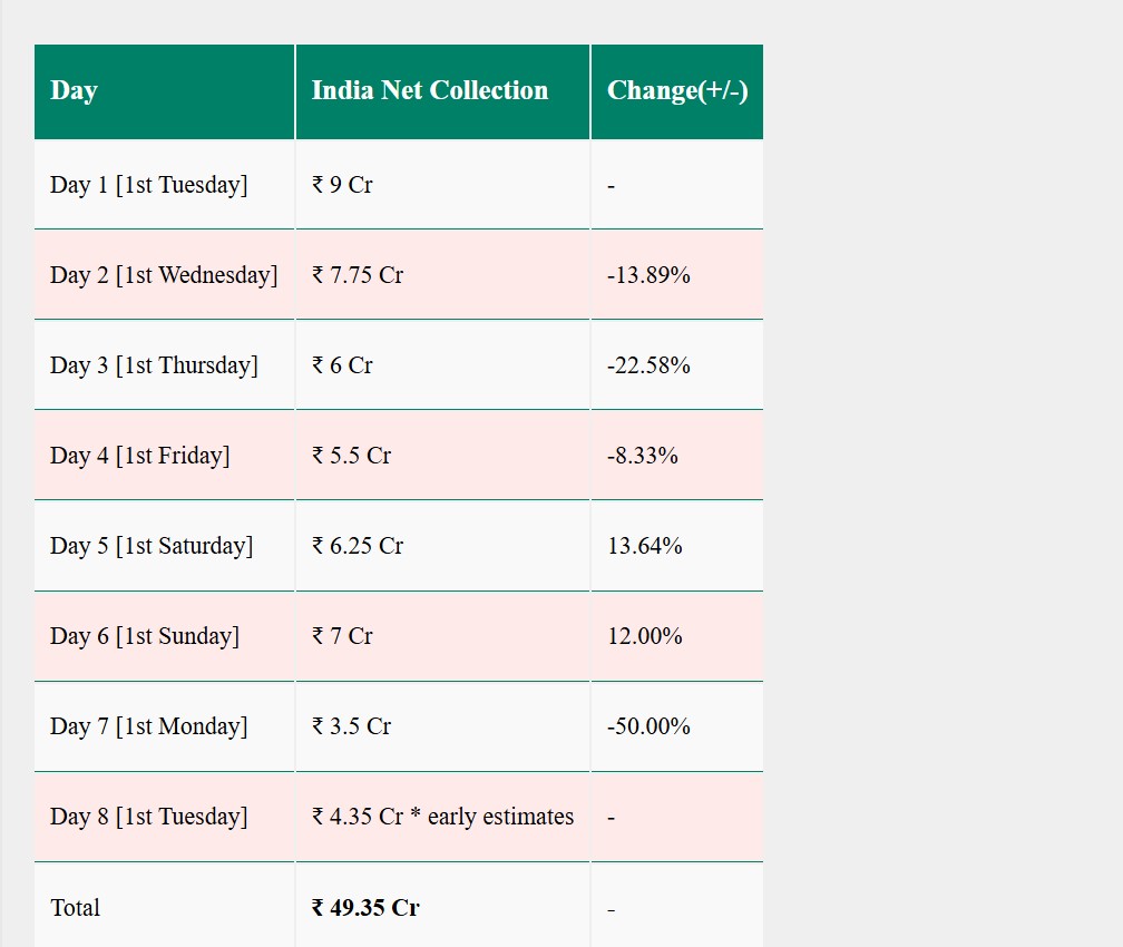 ‘एक दीवाने की दीवानियत’ ने पहले दिन 9 करोड़ रुपये की कमाई थी. दूसरे दिन फिल्म ने 7.75 करोड़, तीसरे दिन 6 करोड़ और चौथे दिन 5.5 करोड़ रुपये कमाए. पांचवें दिन इसका कलेक्शन 6.25 करोड़ और छठे दिन 7 करोड़ रुपये था. सांतवे दिन फिल्म ने सबसे कम कमाई की महज 3.5 करोड़ कमाए और आंठवें दिन इसने 4.35 करोड़ रुपये की कमाई की. इन आठ दिनों की कुल कमाई को मिलाकर फिल्म ने अब तक 49.35 करोड़ रुपये का बिजनेस किया है.