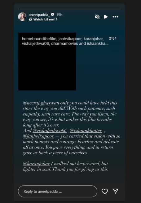 सुपरहिट फिल्म ‘सैयारा’ एक्ट्रेस अनीत पड्डा ने ईशान खट्टर, जाह्नवी कपूर और विशाल जेठवा की मूवी ‘होमबाउंड’ देख ली है. इस फिल्म को देखकर एक्ट्रेस बहुत भावुक हो गई. अनीत ने सोशल मीडिया पर ‘होमबाउंड’ को लेकर एक पोस्ट भी शेयर किया है.