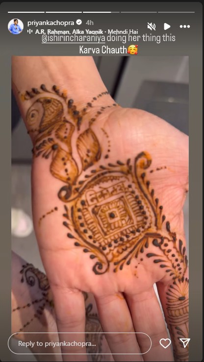प्रियंका चोपड़ा ने करवाचौथ से पहले महेंदी लगवा ली है. एक्ट्रेस ने तैयारियां शुरू कर दी हैं और इसकी झलक इंस्टाग्राम पर देखने को मिल रही है. ग्लोबल आइकॉन प्रियंका चोपड़ा ने एक वीडियो में महेंदी फ्लॉन्ट की है, जिसमें उनके पति निक जोनस का नाम दिखाई दे रहा है.