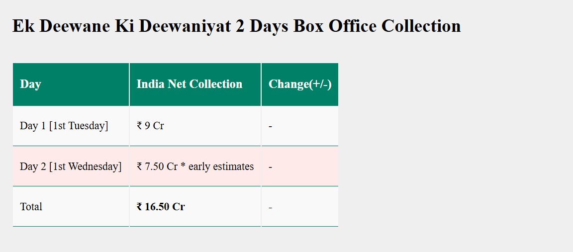 सैकनिल्क.कॉम के मुताबिक, हर्षवर्धन राणे और सोनम बाजवा की फिल्म 'एक दीवाने की दीवानियत' ने दूसरे दिन सिर्फ 7.50 करोड़ रुपये कमाए. दो दिन में फिल्म ने 16.5 करोड़ रुपये की कमाई की है.