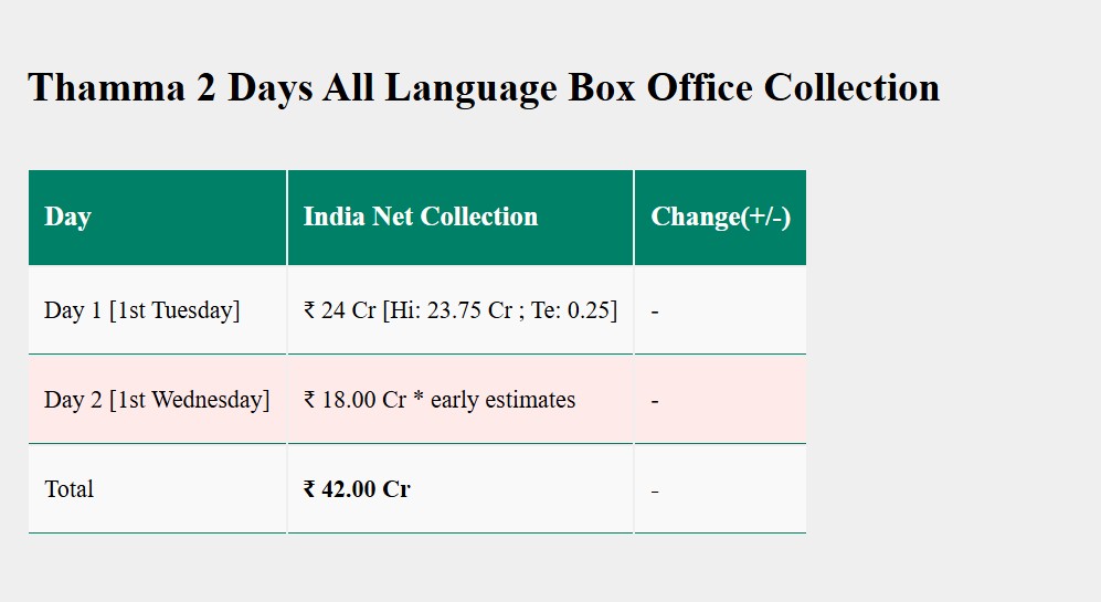 आयुष्मान खुराना और रश्मिका मंदाना की फिल्म 'थामा' ने 24 करोड़ रुपये की कमाई के साथ शानदार ओपनिंग की थी. सैकनिल्क.कॉम के मुताबिक, फिल्म ने दूसरे दिन 18 करोड़ रुपये की कमाई अपने नाम की है.