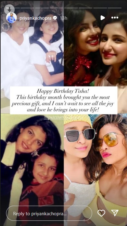 प्रियंका चोपड़ा ने बहन परिणीति को बर्थडे विश करते हुए कुछ नई और बचपन की तस्वीरें शेयर की हैं. साथ ही देसी गर्ल ने लिखा, 'हैप्पी बर्थडे तिशा! ये बर्थडे मंथ तुम्हारे लिए कीमती तोहफा लेकर आया है और मैं ये देखने का इंतजार नहीं कर सकती कि वो तुम्हारी जिंदगी में कितनी खुशियां और प्यार लेकर आया है.'
