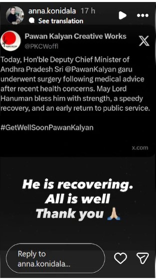Entertainment LIVE Update in Hindi: तेलुगु सिनेमा के स्टार और आंध्र प्रदेश के डिप्टी सीएम पवन कल्याण की अचानक तबीयत खराब होने के बाद उनकी सर्जरी की गई. हाल ही में पवन कल्याण की पत्नी अन्ना कोनिडेला ने उनकी हेल्थ अपडेट देते हुए एक्टर की हालत के बारे में बताया है. उन्होंने अपने इंस्टाग्रामस्टोरी पर एक पोस्ट शेयर किया, जिसमें उन्होंने लिखा, ‘वह ठीक हो रहे हैं. सब ठीक है. धन्यवाद.’ खबरों के अनुसार, पवन कल्याण एक आधिकारिक बैठक के दौरान अचानक बीमार पड़ गए, जिसके बाद उन्हें तुरंत अस्पताल में भर्ती कराया गया. इसके बाद उनकी जन सेना पार्टी की तरफ से एक बयान जारी कर बताया कि पवन कल्याण का शनिवार शाम को ऑपरेशन हुआ. वो पिछले कुछ महीनों से बीमार थे.