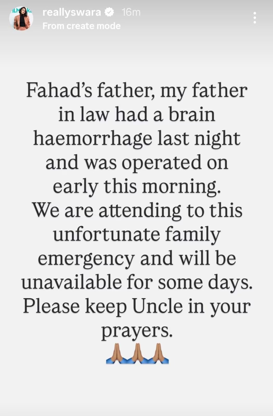 बॉलीवुड एक्ट्रेस स्वरा भास्कर के ससुर को ब्रेन हेमरेज हो गया है, जिसके बाद उनके ससुर को अस्पताल में भर्ती कराया गया है. चलिए जानते हैं कि एक्ट्रेस ने अपने ससुर की तबियत के बारे में क्या कुछ कहा है? पढ़ें पूरी खबर...