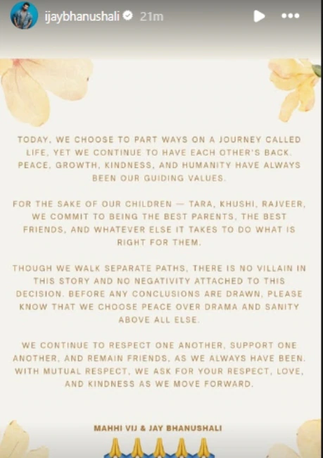 टीवी के मोस्ट पॉपुलर कपल जय भानुशाली और माही विज ने शादी के 14 साल बाद अलग होने का फैसला किया है. कपल ने अपने तलाक की जानकारी इंस्टाग्राम पर पोस्ट शेयर कर दी है. उन्होंने यह फैसला आपसी सहमति से लिया है. इसके अलावा दोनों मिलकर अपने तीनों बच्चों तारा, खुशी और राजवीर की जिम्मेदारी उठाएंगे.यहां पढ़ें पूरी खबर..