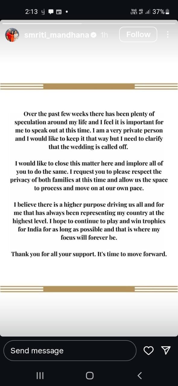 लनसललस भारतीय महिला क्रिकेट टीम की स्टार प्लेयर स्मृति मंधाना और म्यूजिक कंपोजर पलाश मुच्छल की शादी अब कैंसिल हो गई है. स्मृति के बाद पलाश ने भी इस बात की घोषणा की है.