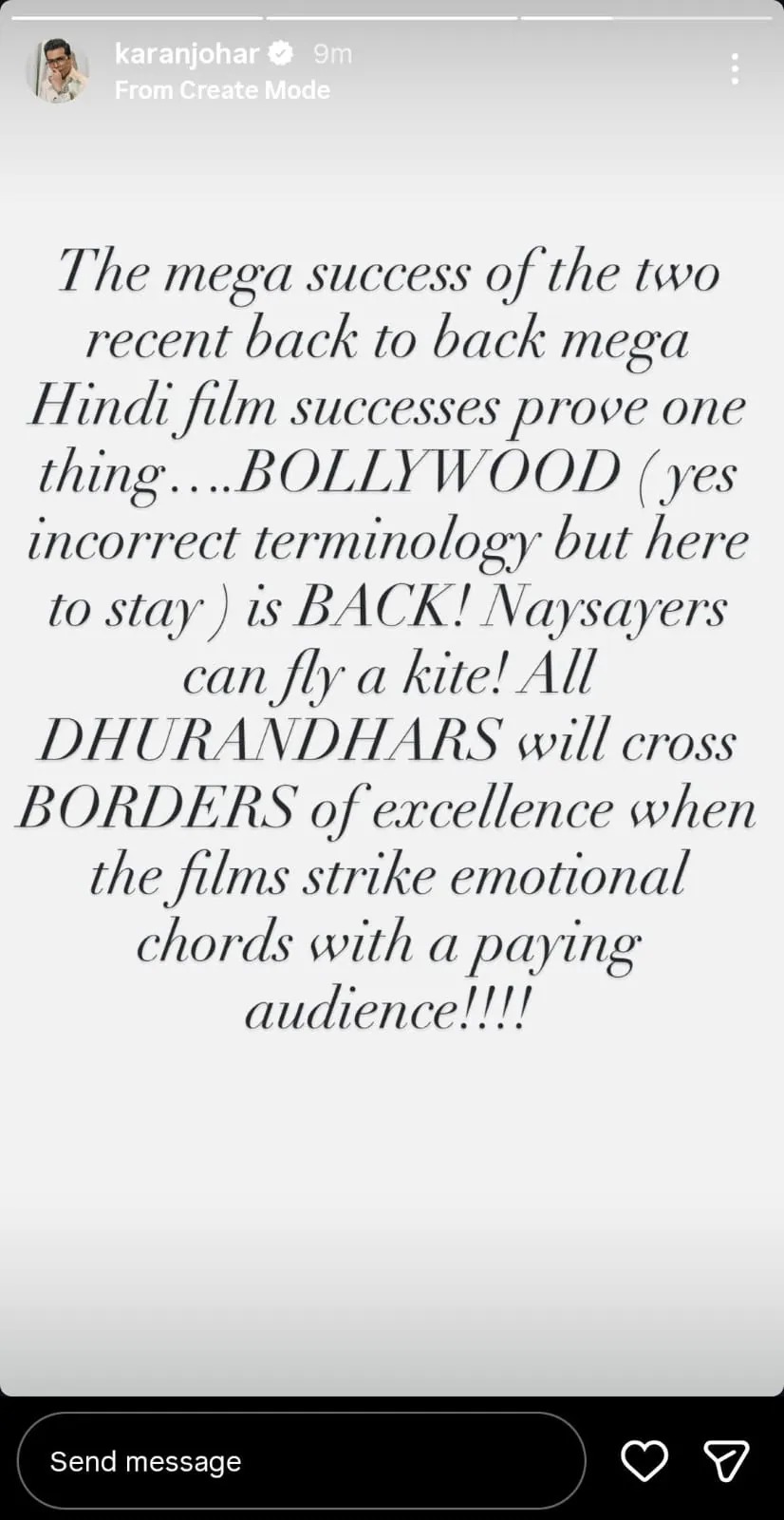 बॉलीवुड फिल्ममेकर करण जौहर ने रणवीर सिंह की ‘Dhurandhar’ और सनी देओल की फिल्म ‘Border 2’ की जबरदस्त सफलता से बेहद खुश हैं. हालही में उन्होंने अपनी ये खुशी इंस्टाग्राम स्टोरी पर सभी के साथ शेयर की. उन्होंने अपनी पोस्ट में लिखा, ‘हाल ही में लगातार रिलीज हुई दो बड़ी हिंदी फिल्मों की सफलता एक बात साबित करती है… बॉलीवुड (हां, यह शब्द थोड़ा गलत है, लेकिन यह चलन कायम रहेगा) वापस आ गया है!’ उन्होंने आगे कहा, ‘जब यह फिल्म टिकट खरीदकर देखने वाले दर्शकों के दिलों को छू लेगी, तो सभी बॉर्डर को पार कर जाएंगे.’