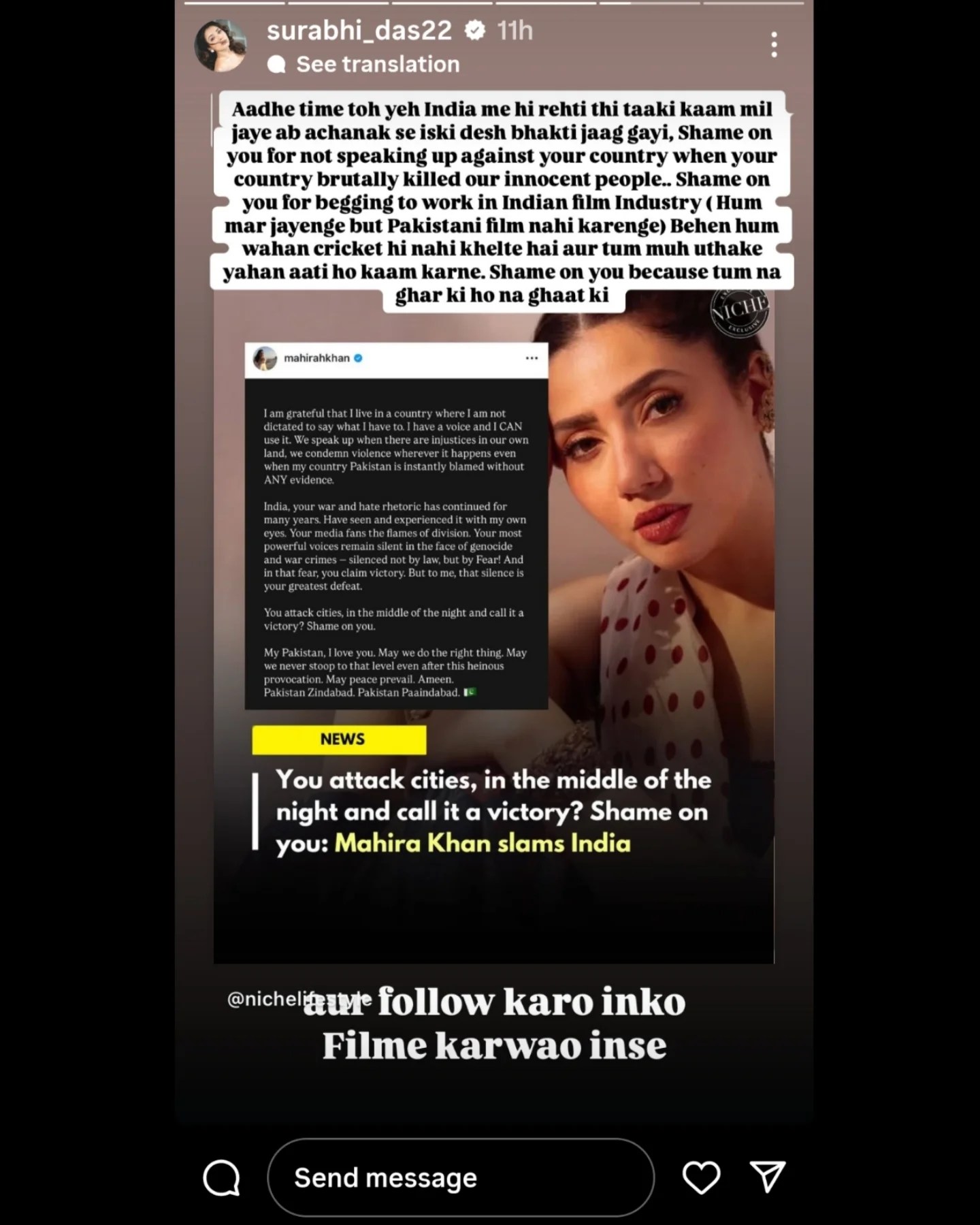 हानिया और सजल ही नहीं बल्कि शाहरुख खान की को-एक्ट्रेस रहीं माहिरा खान को भी सुरभि ने मुंहतोड़ जवाब दिया है। एक्ट्रेस ने इंस्टा स्टोरी पर लिखा, ‘आधे वक्त तो ये भारत में ही रहती थी ताकि काम मिल जाए। अब अचानक से इसकी देशभक्ति जाग गई। शर्म आती है तुमपर कि तुमने अपने देश के खिलाफ तब कुछ नहीं कहा जब वो लोग मासूमों को मार रहे थे। धिक्कार है तुमपर कि तुमने भारतीय फिल्म इंडस्ट्री में काम मांगा। बहन हम वहां क्रिकेट ही नहीं खेलते और तुम मुंह उठाकर यहां आती हो काम करने। धिक्कार है तुमपर क्योंकि तुम न तो घर की हो और न घाट की।’