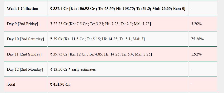 Sacnilk.com की रिपोर्ट के अनुसार, ऋषभ शेट्टी की फिल्म ‘Kantara Chapter 1’ ने 12वें दिन 13.50 करोड़ का कलेक्शन किया है. पिछले 12 दिनों में ये फिल्म का सबसे कम कलेक्शन है. इसी के साथ ही फिल्म ने भारत में अब तक 451.90 करोड़ की कमाई कर ली है. वहीं, इसकी ऑक्यूपेंसी में भी कमी देखी गई, जो कुल 34.86% रही. जिसमें सुबह के शो में 15.91%, दोपहर के शो में 30.82%, शाम के शो में 43.11%, और रात के शो में 49.59% ऑक्यूपेंसी दर्ज की गई.