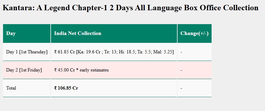 Sacnilk.com की रिपोर्ट के अनुसार, ऋषभ शेट्टी की ‘Kantara Chapter 1’ ने दूसरे दिन 43.65 करोड़ रुपये का कलेक्शन किया है. मालूम हो कि फिल्म ने 61.85 करोड़ की कमाई के साथ बॉक्स ऑफिस पर सुपरहिट ओपनिंग की थी. वहीं दूसरे दिन की कमाई के साथ फिल्म ने भारत में अब तक कुल 105.5 करोड़ का बिजनेस कर लिया है. वहीं इसकी कुल कन्नड़ ऑक्यूपेंसी 82.31% रही, जिसमें सुबह के शो में 60.03%, दोपहर के शो में 90.73%, शाम के शो में 86.48%, और रात के शो में 92.00% रही.