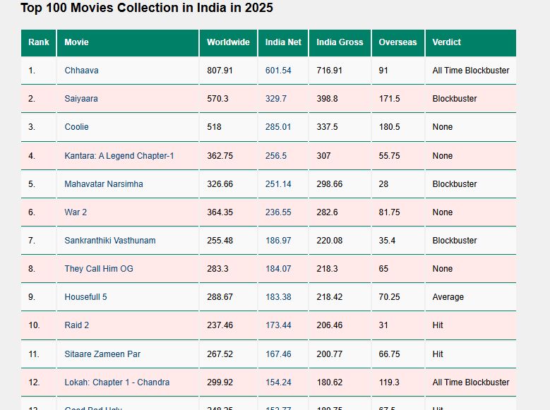 ऋषभ शेट्टी की ‘Kantara Chapter 1’ (362.75 करोड़) जिन 7 सुपरहिट फिल्मों का रिकॉर्ड तोड़ा है, उसमें अश्वीन कुमार की ‘Mahavatar Narsimha’ (326.66 करोड़), वेंकटेश दग्गुबाती की ‘Sankranthiki Vasthunam’ (255.48 करोड़), कल्याणी प्रियादर्शन की ‘Lokah: Chapter 1 – Chandra’ (299.92 करोड़), ऋतिक रोशन की ‘War 2’ (364.35 करोड़), पवन कल्याण की ‘They Call Him OG’ (283.3 करोड़), आमिर खान की ‘Sitaare Zameen Par’ (267.52 करोड़), और अजय देवगन की ‘Raid 2’ (237.46 करोड़) शामिल है.