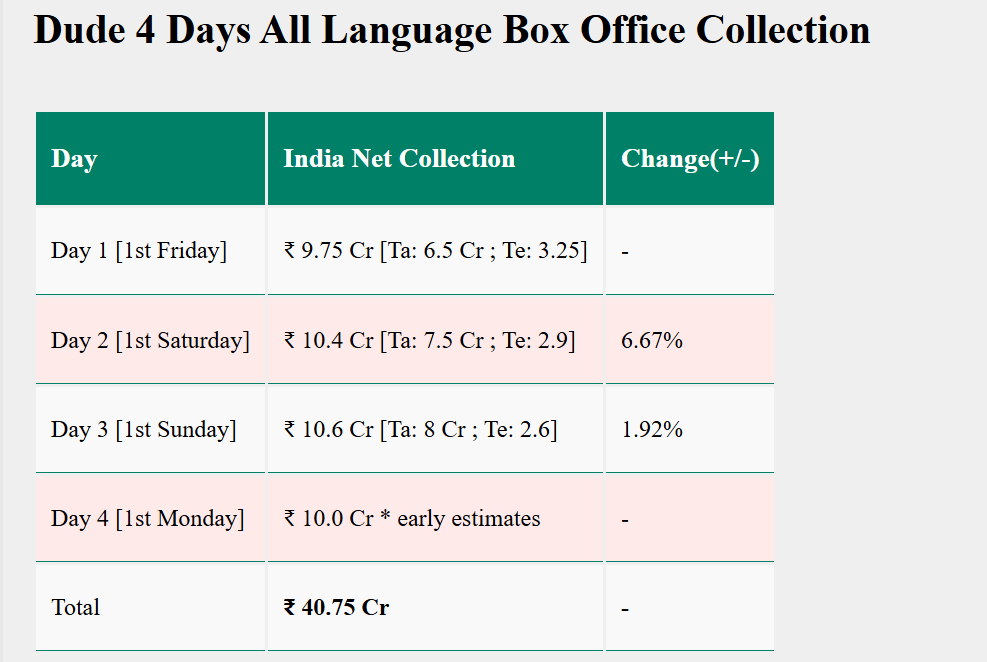 वहीं, दूसरी तरफ तमिल स्टार प्रदीप रंगनाथन की फिल्म ‘Dude’ ने चौथे दिन 10 करोड़ की कमाई की. इसका सीधा मतलब यहीं है कि दिवाली की छुट्टी ने फिल्म की कमाई बढ़ा दी है. इसी के साथ फिल्म ने भारत में अब तक 40.75 करोड़ रुपये का कलेक्शन किया है. दिवाली के दिन इसकी कुल ऑक्यूपेंसी 56.98% रही, जिसमें सुबह के शो में 29.97%, दोपहर के शो में 70.70%, शाम के शो में 59.85% और रात के शो में 67.38% रहा.