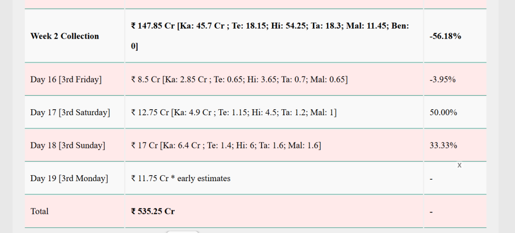 Sacnilk.com की रिपोर्ट के अनुसार, ऋषभ शेट्टी की फिल्म ‘Kantara Chapter 1’ ने 19वें दिन 11.75 करोड़ का कलेक्शन किया है. ये कहना गलत नहीं होगा कि फिल्म को दिवाली की छुट्टी का पूरा फायदा मिला है. इस कलेक्शन के साथ फिल्म ने इंडियन बॉक्स ऑफिस पर अब तक कुल 535.25 करोड़ का व्यापार कर लिया है. वहीं, इसकी कुल ऑक्यूपेंसी 13.58% रही, जिसमें सुबह के शो में 9.17%, दोपहर के शो में 17.20%, शाम के शो में 11.87% और रात के शो में 16.07% रहा.
