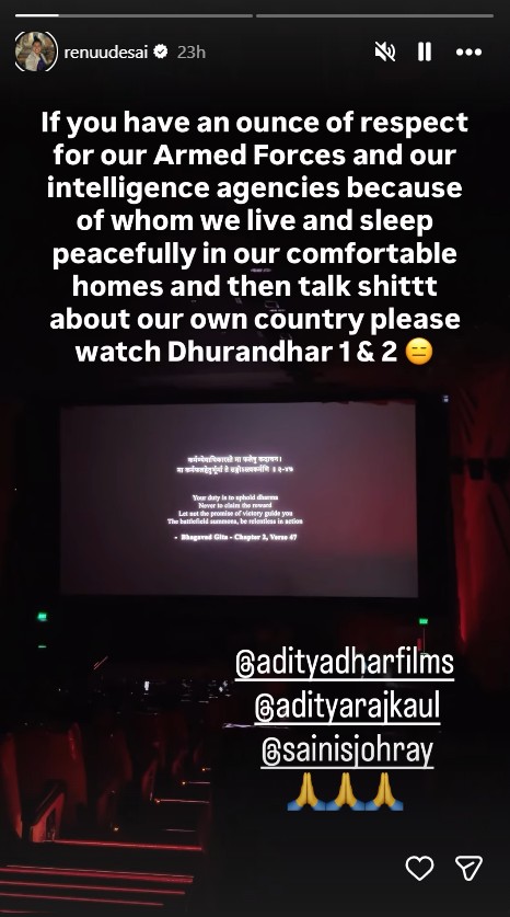 इसी कड़ी में एक्ट्रेस और साउथ सुपरस्टार पवन कल्याण की एक्स वाइफ रेनू देसाई ने इंस्टाग्राम पर आदित्य धर की धुरंधर का रिव्यू शेयर किया है. रेनू ने लिखा, “अगर आपके मन में हमारी सेना और हमारी इंटेलिजेंस एजेंसियों के लिए जरा भी इज्जत है, जिनकी वजह से हम अपने आरामदायक घरों में चैन से रहते और सोते हैं और फिर भी आप अपने ही देश के बारे में बकवास करते हैं, तो प्लीज ‘धुरंधर 1 और 2’ जरूर देखें. आपका फर्ज है कि आप धर्म का पालन करें, कभी भी फल की इच्छा न करें. जीत का वादा आपको गुमराह न करे. युद्ध का मैदान आपको पुकार रहा है, अपने कर्मों में अडिग रहें. भगवद गीता—अध्याय 2, श्लोक 47.”