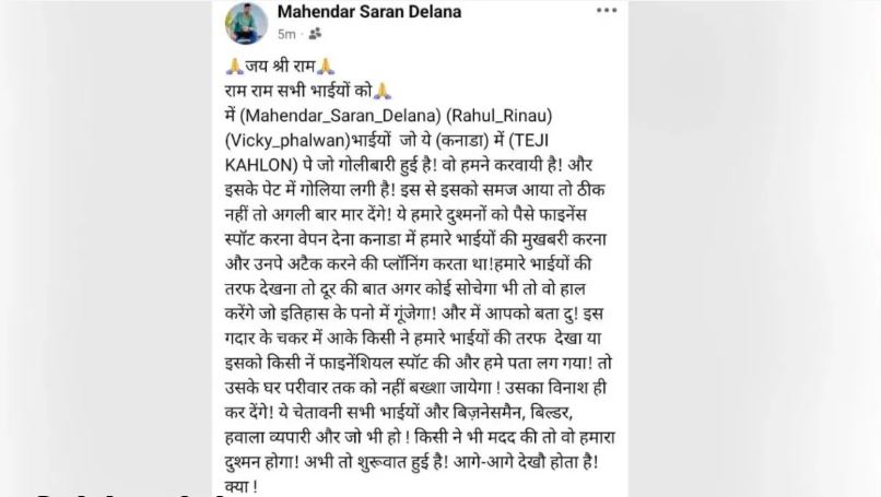 मीडिया रिपोर्ट्स के मुताबिक, रोहित गोदारा गैंग के गैंगस्टर महेन्द्र सरन ने सोशल मीडिया पर धमकी से भरा पोस्ट शेयर किया है. इस पोस्ट में पोस्ट में लिखा, ‘तेजी कहलों पर जो गोलीबारी हुई है वो हमने करवाई है. उसके (तेजी कहलों) के पेट में गोलियां लगी हैं. इससे उसे समझ में आया तो ठीक नहीं तो अगली बार मार देंगे. पोस्ट में आगे लिखा, ‘ये हमारे दुश्मनों को हथियार सप्लाई करता था और हम लोगों की जासूसी करवाता था. इसके अलावा हम पर अटैक करने की प्लानिंग करता था. इसलिए उस पर ये हमला करवाया गया है.’