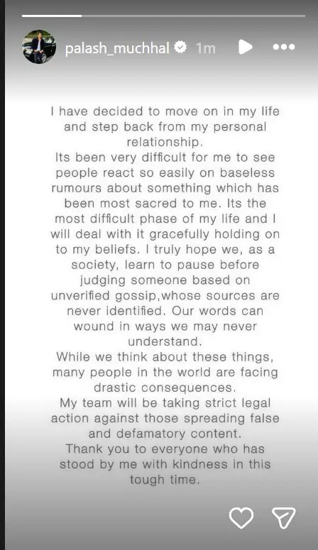 वहीं, स्मृति के साथ शादी कैंसिल होने पर पलाश मुच्छल ने भी रिएक्ट किया. उन्होंने अपनी इंस्टाग्राम स्टोरी पर एक पोस्ट शेयर की जिसमें उन्होंने लिखा, ‘मैंने अपनी लाइफ में आगे बढ़ने और अपने प्राइवेट रिलेशन से पीछे हटने का फैसला किया है. मेरे लिए यह देखना बहुत मुश्किल रहा है कि लोग मेरे सबसे पवित्र रिश्ते के बारे में अफवाहें उड़ा रहे हैं. यह मेरी जिंदगी का सबसे मुश्किल समय है.’ इसके साथ ही उन्होंने चेतावनी देते हुए कहा कि फर्जी खबरें फैलाने वालों के खिलाफ कार्रवाई की जाएगी.