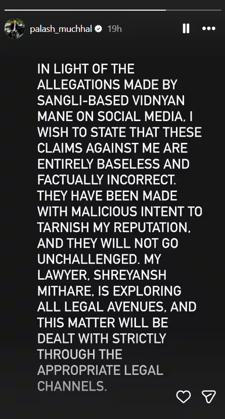 हालांकि माने के दावों के बाद पलाश का भी रिएक्शन आया है. उन्होंने इंस्टाग्राम पर स्टोरी पोस्ट करते हुए लिखा, “सोशल मीडिया पर सांगली के विज्ञान माने द्वारा लगाए गए आरोपों के संबंध में, मैं यह बताना चाहता हूं कि मेरे खिलाफ ये दावे पूरी तरह से बेसलेस और फैक्चुअली गलत हैं. ये मेरी इमेज को खराब करने के गलत इरादे से किए गए हैं और इन्हें बिना चैलेंज के नहीं छोड़ा जाएगा. मेरे वकील, श्रेयांश मिथरारे सभी कानूनी रास्ते तलाश कर रहे हैं और इस मामले से उचित कानूनी चैनलों के माध्यम से सख्ती से निपटा जाएगा.