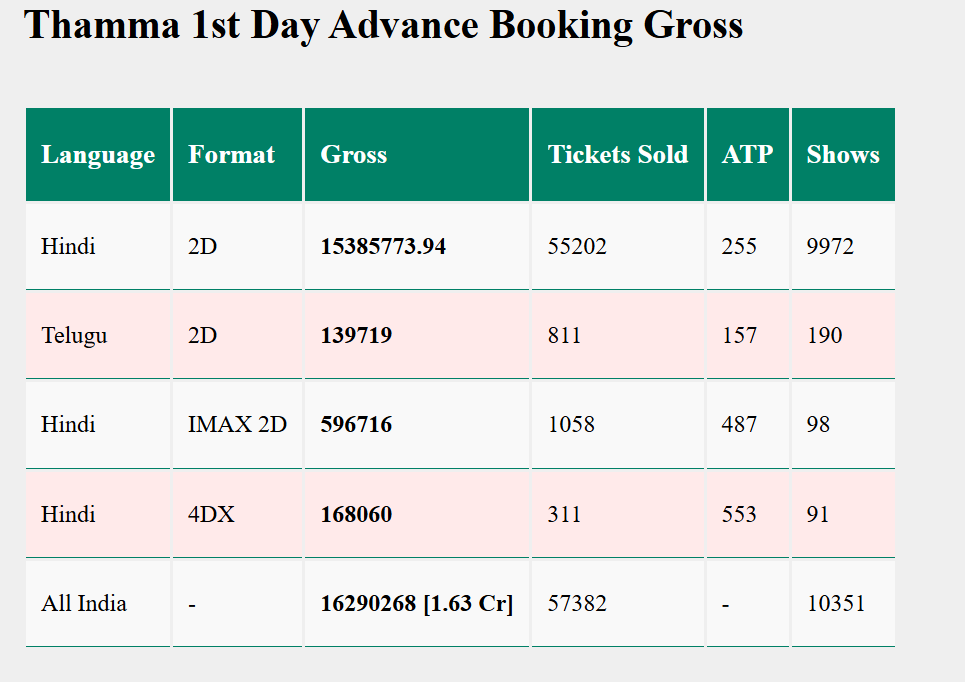 Sacnilk.com की रिपोर्ट के अनुसार, आयुष्मान खुराना और रश्मिका मंदाना की फिल्म ‘थामा’ ने पहले दिन एडवांस बुकिंग में 1.63 करोड़ का कलेक्शन किया है. वहीं, ब्लॉक सीट्स के साथ फिल्म की कमाई 5.03 करोड़ रुपये तक पहुंच गई है. फिल्म ‘थामा’ के 57382 टिकट के साथ 10351 शो बुक हो चुके हैं. मूवी की सबसे ज्यादा टिकट दिल्ली, महाराष्ट्र और उत्तर प्रदेश में बुक हुई हैं. फिल्म ने ब्लॉक सीट्स के साथ महाराष्ट्र में 1.18 करोड़, उत्तर प्रदेश में 41.9 लाख और दिल्ली में 1.07 करोड़ की एडवांस बुकिंग कर चुकी है.