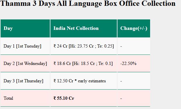 Sacnilk.com की रिपोर्ट के अनुसार, आयुष्मान खुराना और रश्मिका मंदाना की ‘Thamma’ ने तीसरे दिन 12.50 करोड़ रुपये की कमाई की. इसी के साथ फिल्म ने भारत में अब तक 55.10 करोड़ रुपये का कारोबार किया है. वहीं, तीसरे दिन इसकी हिंदी ऑक्यूपेंसी कुल 19.38% रही. जिसमें मॉर्निंग शो में 7.52%, आफ्टरनून शो में 19.35%, इवनिंग शो में 25.52%, और नाइट शो में 25.14% रहा.