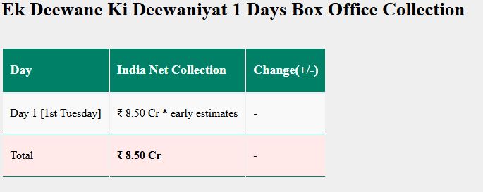 वहीं, दूसरी तरफ हर्षवर्धन राणे और सोनम बावेजा की फिल्म ‘Ek Deewane Ki Deewaniyat’ ने पहले दिन बॉक्स ऑफिस पर 8.50 करोड़ की कमाई की है. इसी के साथ फिल्म ने बॉक्स ऑफिस पर ठीक-ठाक शुरुआत की. ये कहा जा सकता है कि फिल्म को दिवाली की छुट्टी का कुछ खास फायदा नहीं हुआ है. पहले दिन इसकी कुल हिंदी ऑक्यूपेंसी 39.51% रही, जिसमें सुबह के शो में 19.76%, दोपहर के शो में 46.34%, शाम के शो में 47.16%, और रात के शो में 44.76% रही.