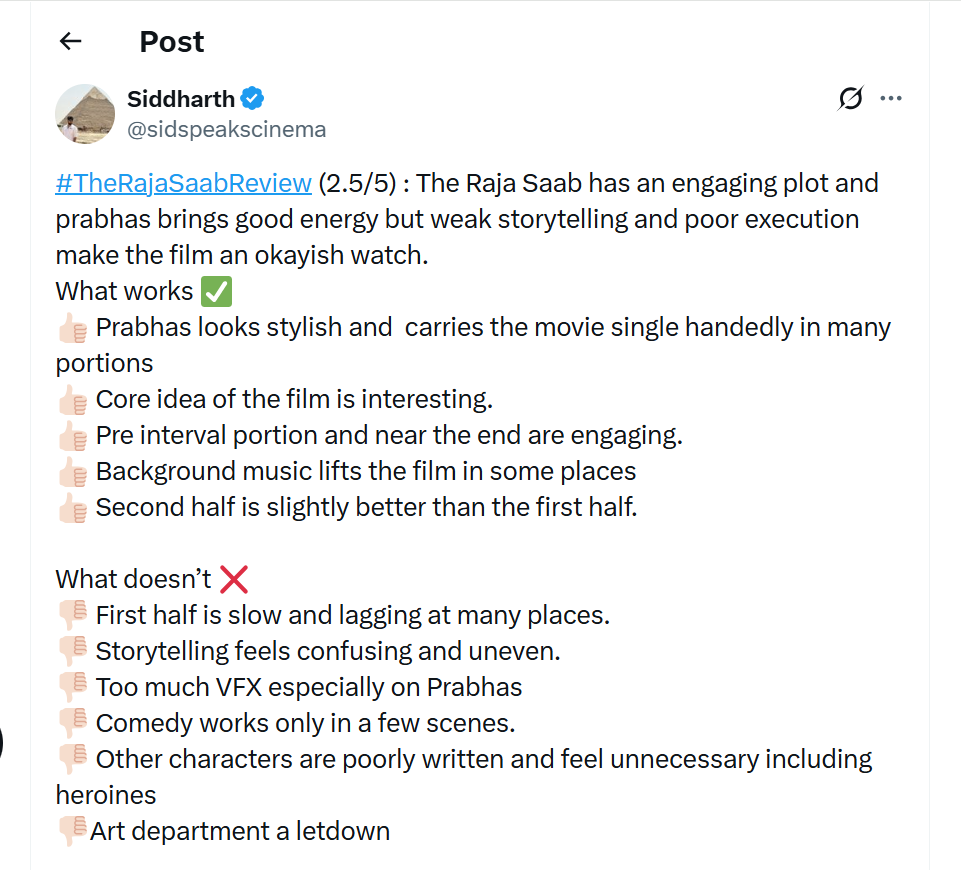 The Review: A Royal Mess#TheRajaSaab is a colossal disappointment that fails to live up to the massive expectations surrounding a Prabhas starrer. While the teaser promised a "Maruthi Brand" entertainer with a horror-comedy… pic.twitter.com/4fLmOQujHz