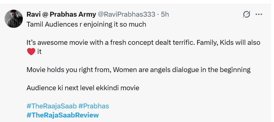 एक अन्य यूजर ने लिखा, “The RajaSaab Review रेटिंग- 1.डिजास्टर. द राजा साब एक बेहद निराशाजनक फिल्म है जो प्रभास अभिनीत फिल्म से जुड़ी भारी उम्मीदों पर खरी नहीं उतरती. टीज़र ने हॉरर-कॉमेडी ट्विस्ट के साथ “मारुति ब्रांड” की मनोरंजक फिल्म का वादा किया था, लेकिन आखिर में यह आत्माहीन, अव्यवस्थित और शोरगुल से भरी औसत दर्जे की फिल्म है.