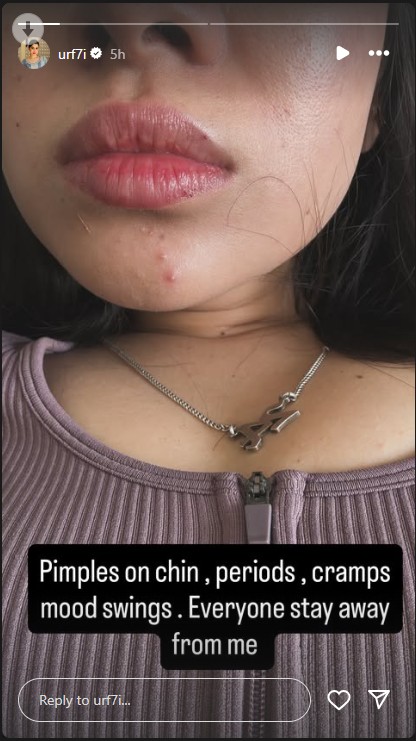 वहीं, उर्फी ने कुछ देर बाद इस वीडियो को सोशल मीडिया से डिलीट भी कर दिया. लगता है कि अब वो अपना ये चेहरा दुनिया को दिखाना नहीं चाहतीं. दूसरी तरफ उर्फी ने इंस्टाग्राम स्टोरी पर भी एक सेल्फी शेयर की है. इस फोटो में एक्ट्रेस ने अपनी चिन दिखाई है, जिस पर पिम्पल नजर आ रहे हैं. इस फोटो को शेयर करते हुए उर्फी ने लिखा, ‘चिन पर पिम्पल, पीरियड्स, क्रैम्प्स, मूड स्विंग्स. सब मुझसे दूर रहो.’ अब उर्फी का ये कैप्शन देखकर समझ आ रहा है कि वो कितनी परेशान हैं.