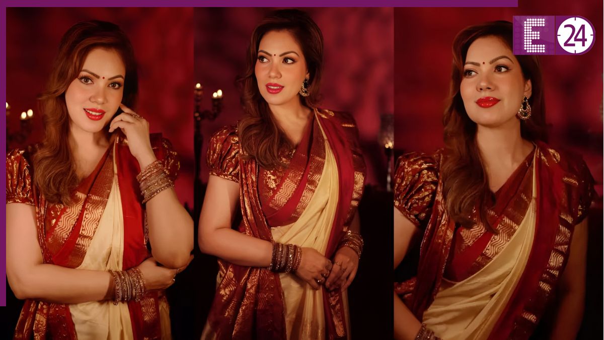 क्रीम और रेड साड़ी का जादू- मुनमुन ने बेहद खूबसूरत क्रीम और रेड कॉम्बिनेशन वाली साड़ी पहनी है. साड़ी का गोल्डन बॉर्डर इसे एक रिच और ट्रेडिशनल फील दे रहा है, जो उनके पूरे लुक को और भी खास बना रहा है.