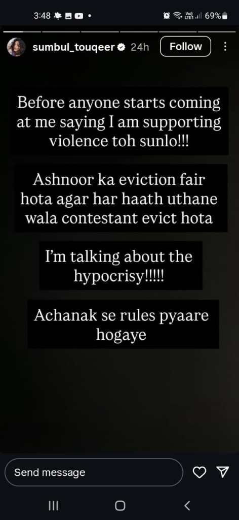 सुम्बुल ने आगे कहा, ‘लात तो तान्या ने भी अशनूर को मारी थी और धक्का भी मारा था. तब क्या ये आंखों में पट्टी बांध के बैठे थे? अशनूर कौर.’ इसके बाद सुम्बुल ने ‘बिग बॉस 19’ के मेकर्स के इस फैसले को ‘हिपोक्रेसी’ बताया. उन्होंने आगे लिखा, ‘इससे पहले कि कोई मेरे पास आकर कहे कि मैं हिंसा का समर्थन कर रही हूं तो सुन लो. अशनूर का एविक्शन तब फेयर होता, जब हर हाथ उठाने वाला कंटेस्टेंट एविक्ट होता. मैं तो मेकर्स की हिपोक्रेसी के बारे में बात कर रही हूं. अचानक से नियम प्यारे हो जाएंगे.