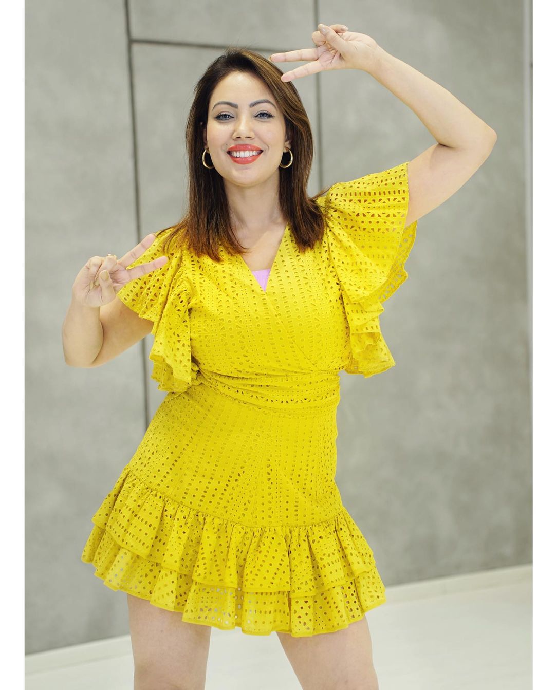 मुनमुन दत्ता ने येलो शॉर्ट ड्रेस पहनी हैं।